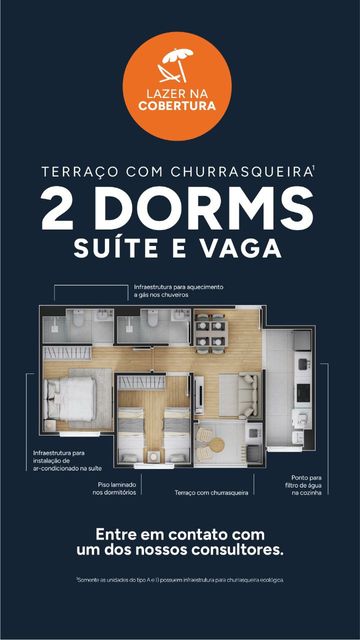 2 dormitórios bem distribuídos, perfeitos para casal, solteiros, família pequena ou home office;