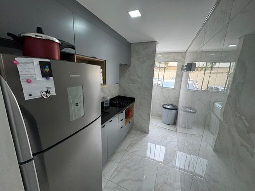 Cozinha funcional, com boa disposição para armários e eletrodomésticos;