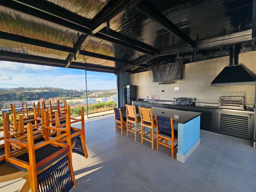 Dispõe de garagem para 7 veículos, sendo 3 vagas cobertas e 4 descobertas.