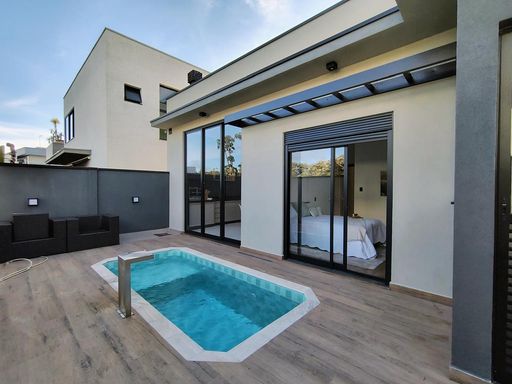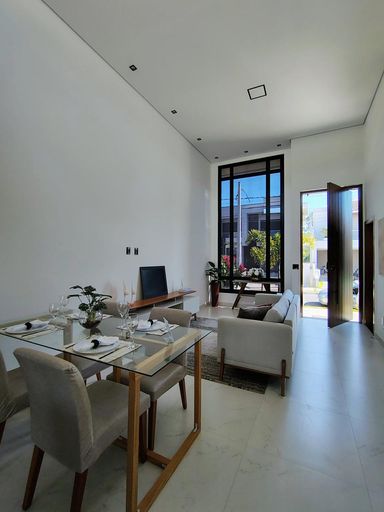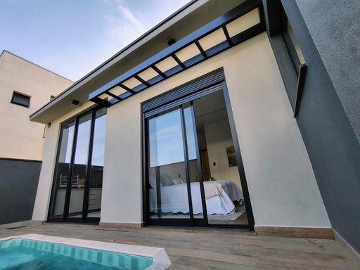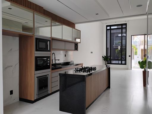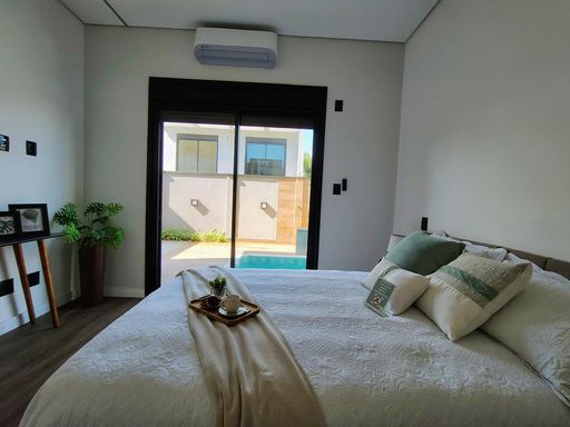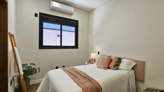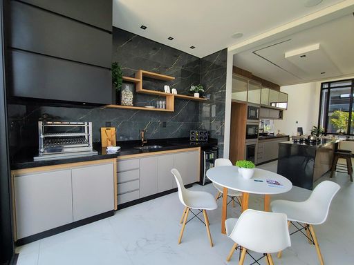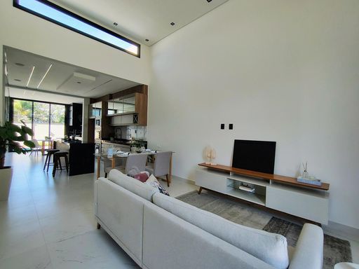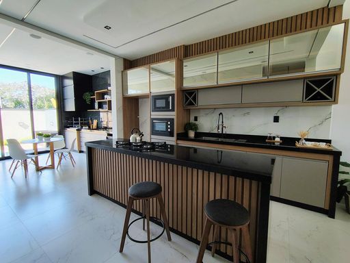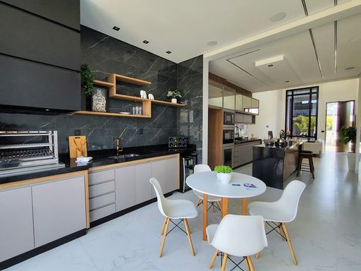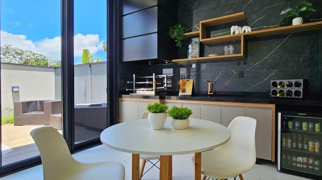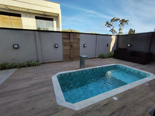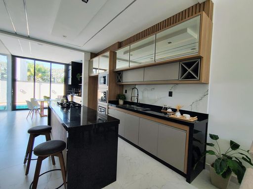 Possui 3 suítes completas com planejados, lavabo, cozinha equipada, área gourmet com churrasqueira e cervejeira, lavanderia coberta, piscina e até 4 vagas de garagem.