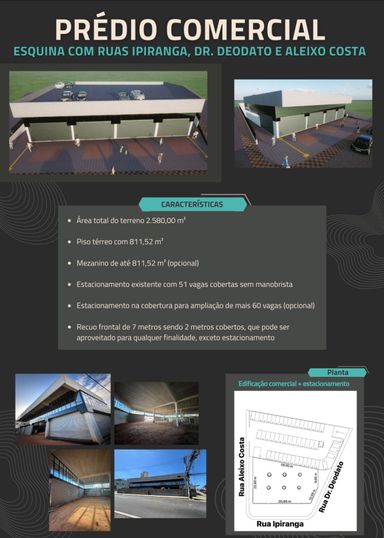 O imóvel está em um terreno de 2.580m² e conta com 811,52m² de construção no piso térreo, mais 811,52m² de mezanino. Possui estacionamento com 51 vagas cobertas e cobertura preparada para ampliação de até 60 vagas adicionais. Recuo frontal de 7 metros, sendo 2 metros cobertos, ideal para carga e descarga. Projeto moderno, versátil e funcional.